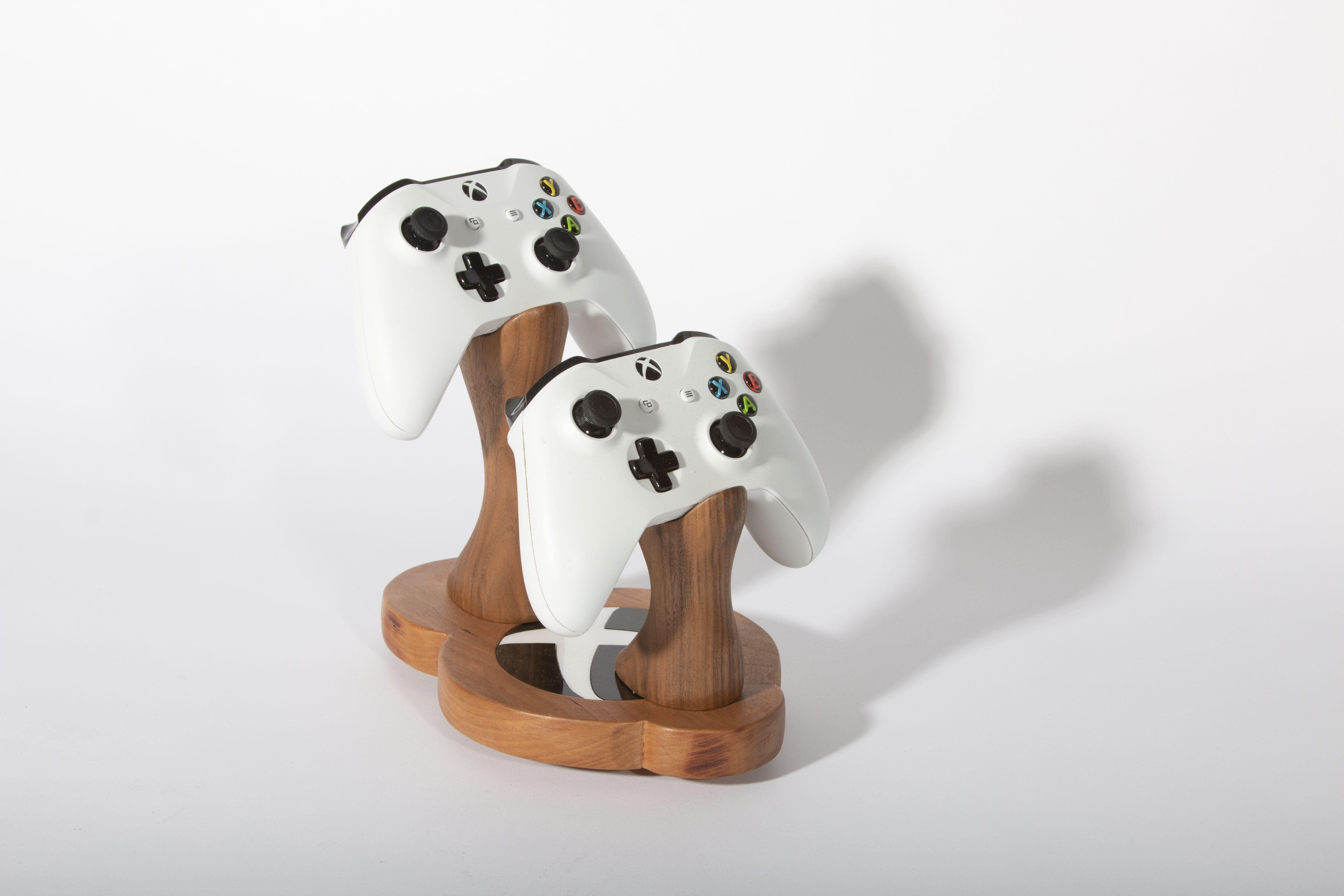 the pieces are attached to base with mortise and tenon joints. the base piece contains an acrylic Xbox logo created on the laser cutter.